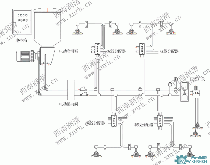 雙線干油集中潤滑系統(tǒng)是傳統(tǒng)干油集中潤滑的一種比較常見的潤滑方式(又稱FARVAL方式),適用于潤滑點集中,潤滑點所需油量大致相同的大型系統(tǒng),造價較低。