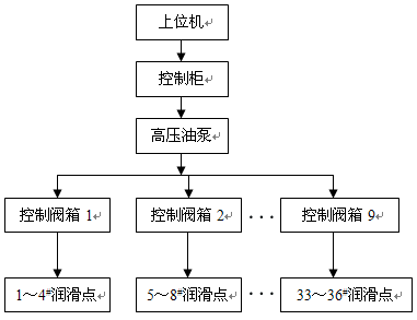 控制柜首先啟動(dòng)高壓油泵,將油脂輸送到主油管,隨后控制柜打開第一個(gè)潤(rùn)滑點(diǎn)電磁開關(guān),向該油點(diǎn)供油,即從高壓油泵至第一個(gè)潤(rùn)滑點(diǎn)形成一個(gè)輸油通路,此時(shí)其他潤(rùn)滑點(diǎn)電磁開關(guān)均關(guān)閉,油泵壓力全部集中在此潤(rùn)滑點(diǎn),確保該點(diǎn)供油壓力。當(dāng)?shù)谝粋€(gè)潤(rùn)滑點(diǎn)供油結(jié)束,控制柜關(guān)閉其電池開關(guān),同時(shí)打開第二個(gè)潤(rùn)滑點(diǎn)電磁開關(guān),向其供油,供油過程和第一個(gè)潤(rùn)滑點(diǎn)相同,以此類推,系統(tǒng)對(duì)所有潤(rùn)滑點(diǎn)逐點(diǎn)供油。當(dāng)最后一個(gè)潤(rùn)滑點(diǎn)供油結(jié)束,系統(tǒng)進(jìn)入循環(huán)時(shí)間后,系統(tǒng)自啟動(dòng),周而復(fù)始,實(shí)現(xiàn)對(duì)中速磨煤機(jī)系統(tǒng)的智能化供油。