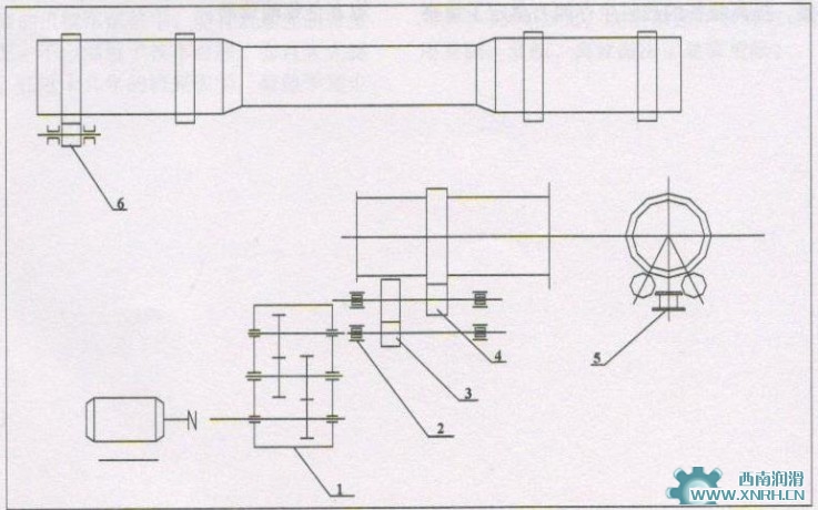 1.齒箱;2.傳動(dòng)軸承;3.傳動(dòng)齒輪;4.開始齒輪;5.擋輪瓦;6.托輪瓦