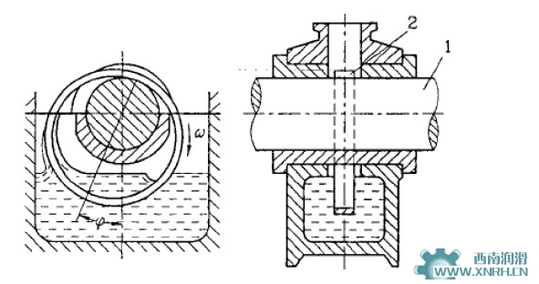 如圖所示,套在軸1上的油環(huán)2下部在油池中,當(dāng)軸旋轉(zhuǎn)時(shí),靠摩擦力帶動(dòng)油環(huán)轉(zhuǎn)動(dòng),從而把油帶入軸承中進(jìn)行潤(rùn)滑。