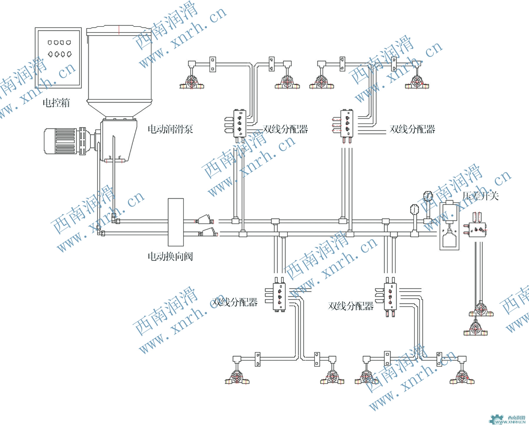 雙線系統(tǒng)工作時,首先電動潤滑泵(或手動潤滑泵)開始動作打油,油脂經(jīng)換向閥交替由兩條管路輸送到雙線分配器,向潤滑點注油。供油管內(nèi)的壓力達到分配器所需動作壓力,分配器進行動作,而分配器動作完成又使油管內(nèi)壓力繼續(xù)上升,當供油管各次壓力都使分配器完成動作(系統(tǒng)完成一次給油運行)后,系統(tǒng)壓力升到換向閥換向壓力,換向閥換向進行二次給油。