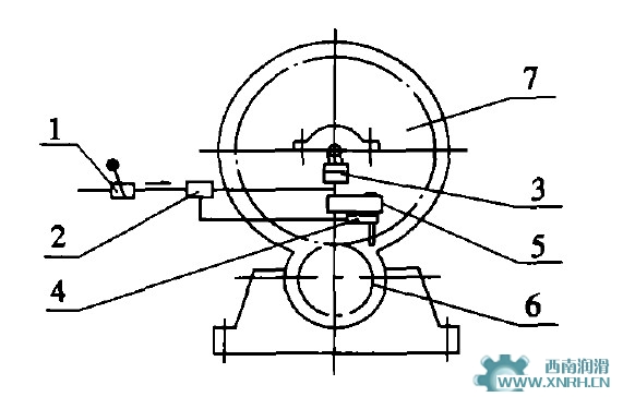 1.滾筒操作閥 2.導(dǎo)氣三通 3.梭閥 4.氣控自動(dòng)潤(rùn)滑閥 5.潤(rùn)滑油箱 6.小齒輪 7.大齒輪